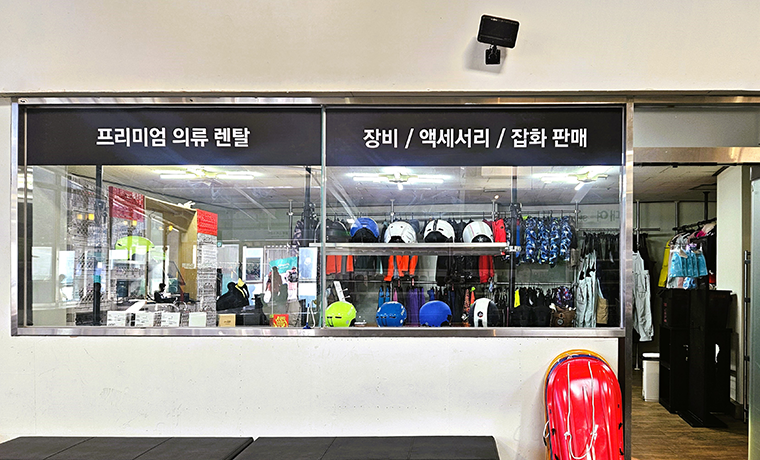- 스키 학교 라운지 내부 다양한 라인 업의 의류 렌탈 샵! 리조트에서 가까운 렌탈 샵에서 편하게 준비하고 슬로프를 마음껏 즐겨 보세요.